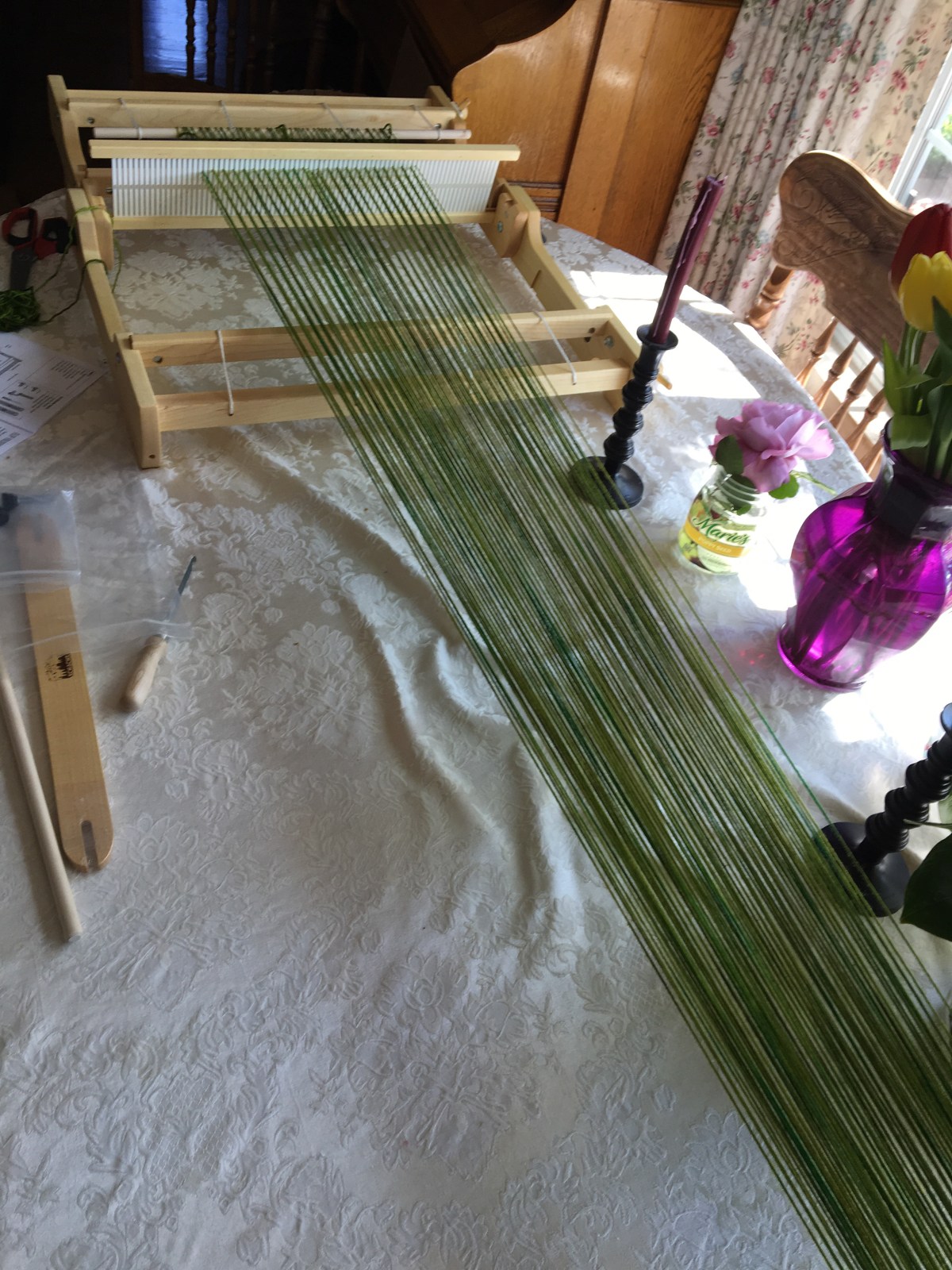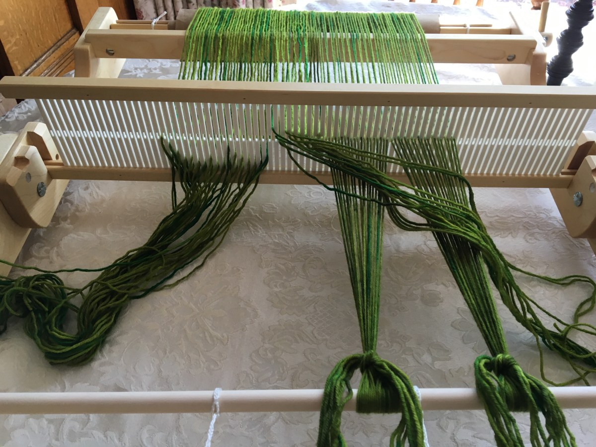 I followed directions from a video for direct warping with a peg. I’ve learned that warping is really easy. Considering it was a first time, I found it was pretty straight forward. Cutting the string at the end once removing it from the peg, was the tiniest bit nerve wracking, but they were already safe in their slots. The next time I have to make this cut, I won’t think twice about it.