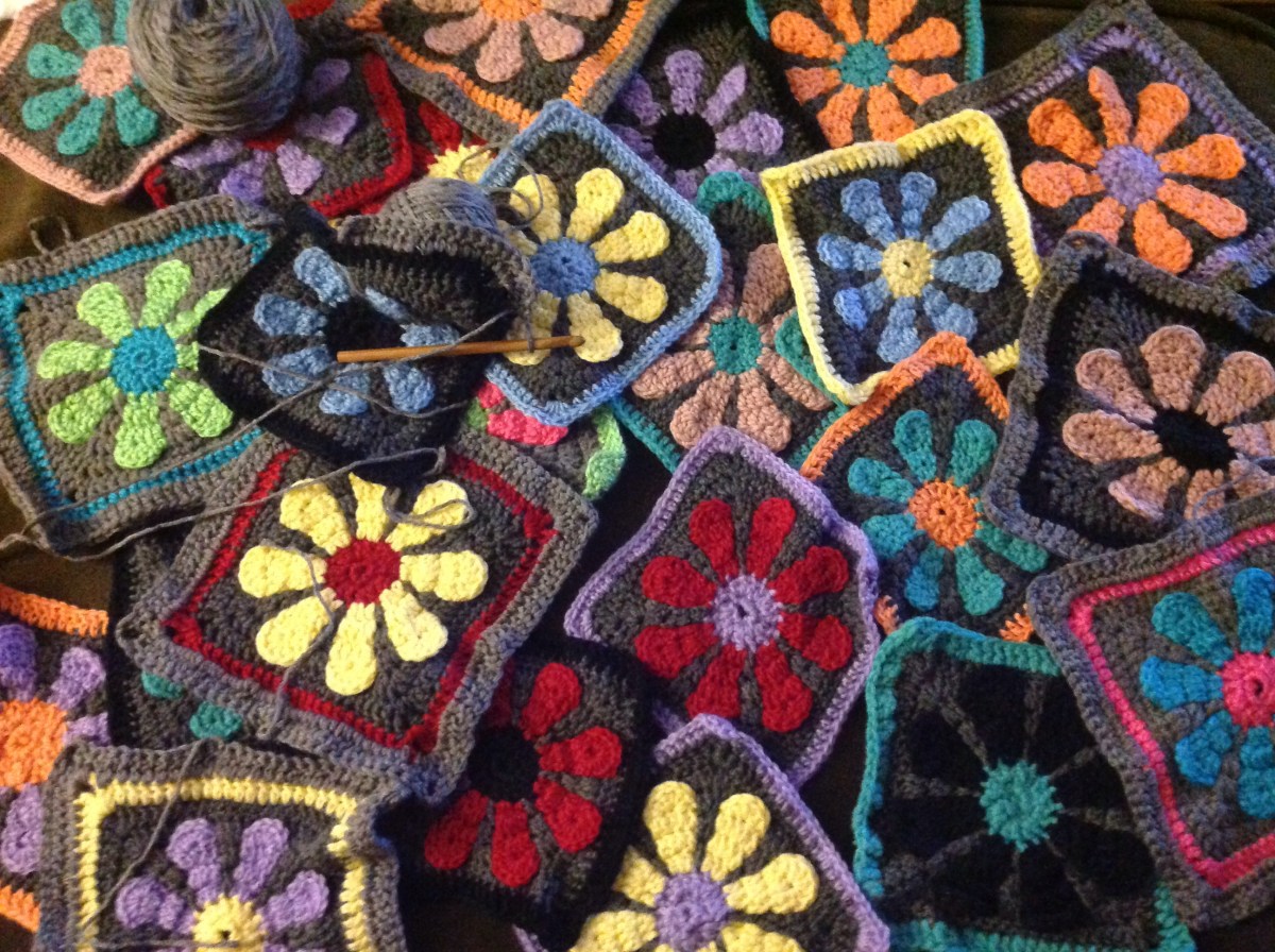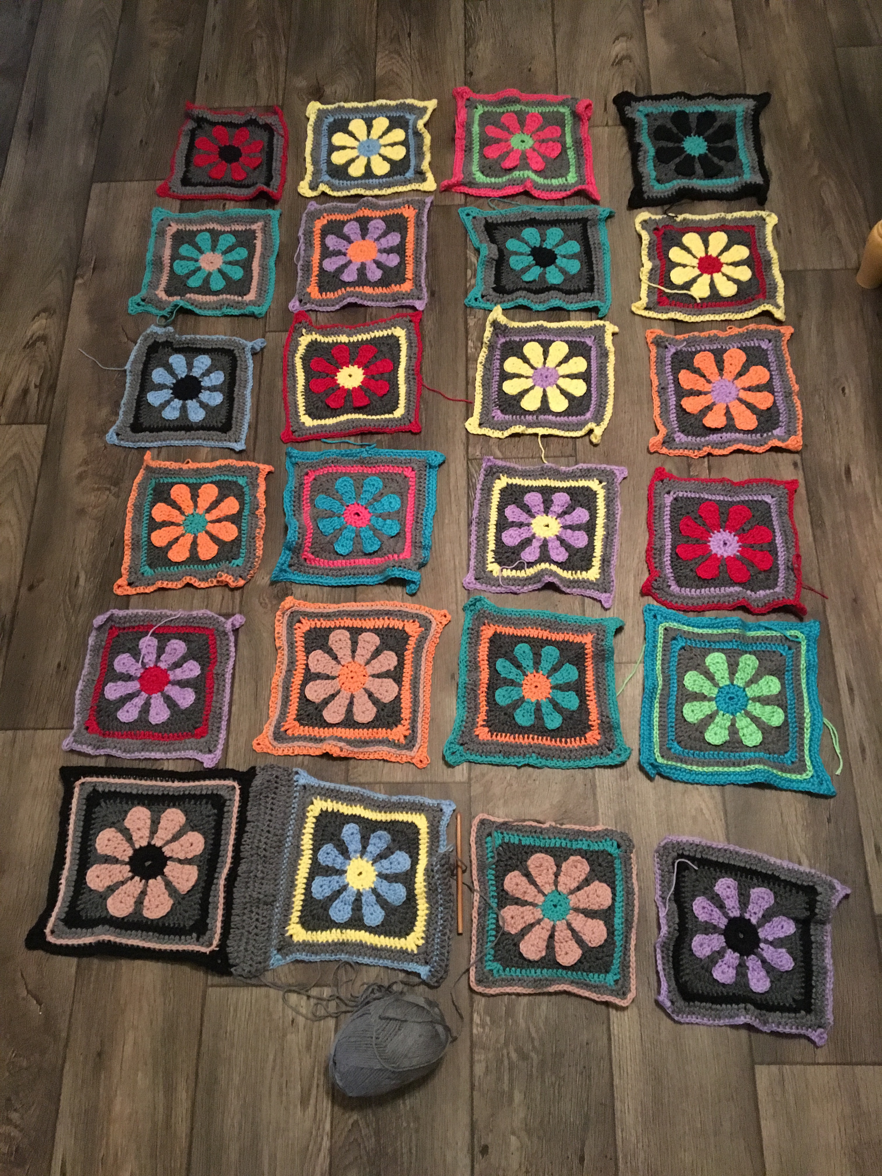 The Daisy Square Charity afghan. I have crocheted all the squares I’m going to do. I need to wrap this bad boy up. Because I was just starting and knew nothing about gauge, the squares are made of different weight yarns, and at different tensions, possibly different hook sizes, some are cotton some are acrylic?? The squares are different sizes. I don’t know how much blocking will accomplish, but who cares it’s a mess anyways. It will always be special because this is where it started.