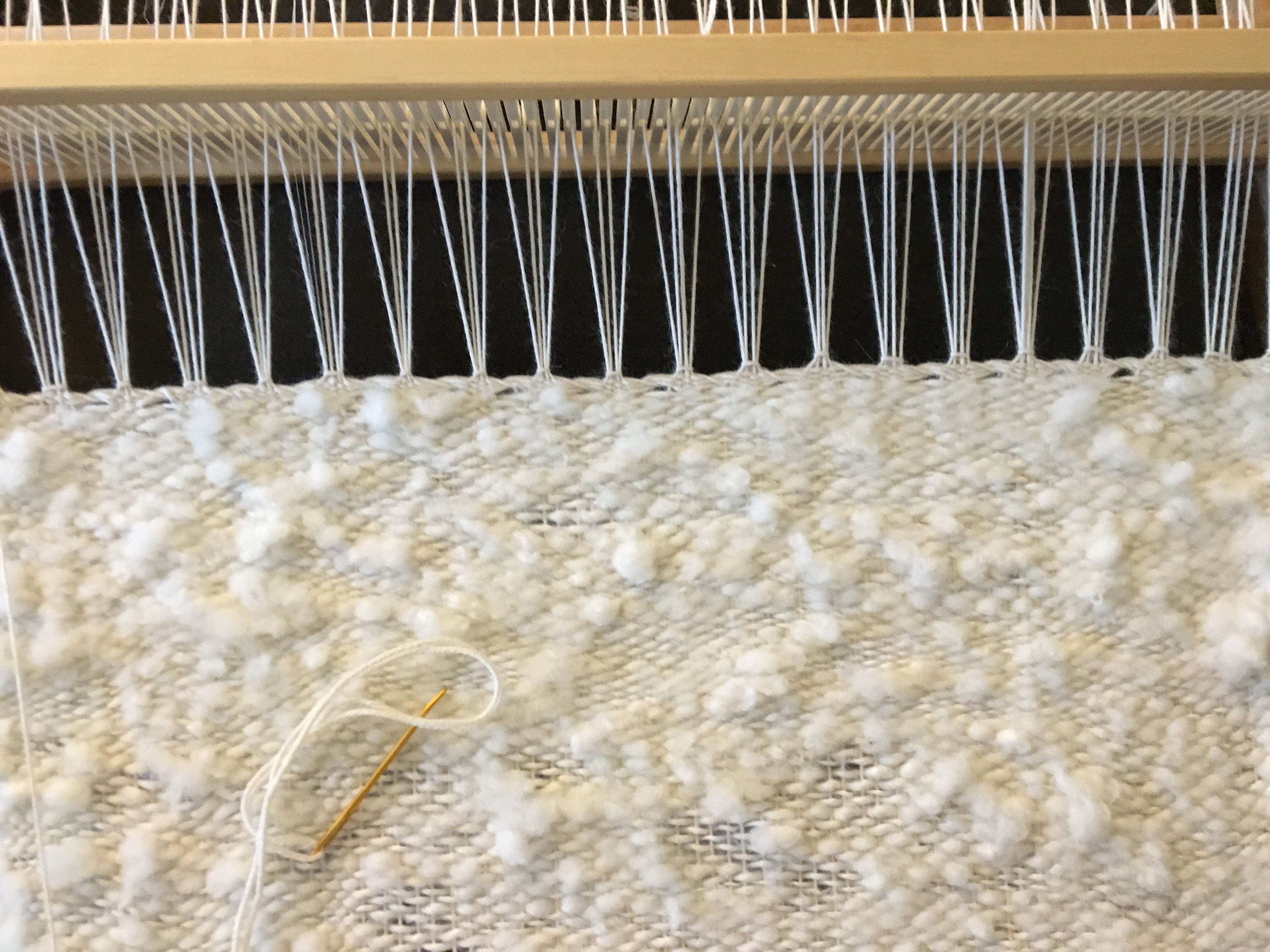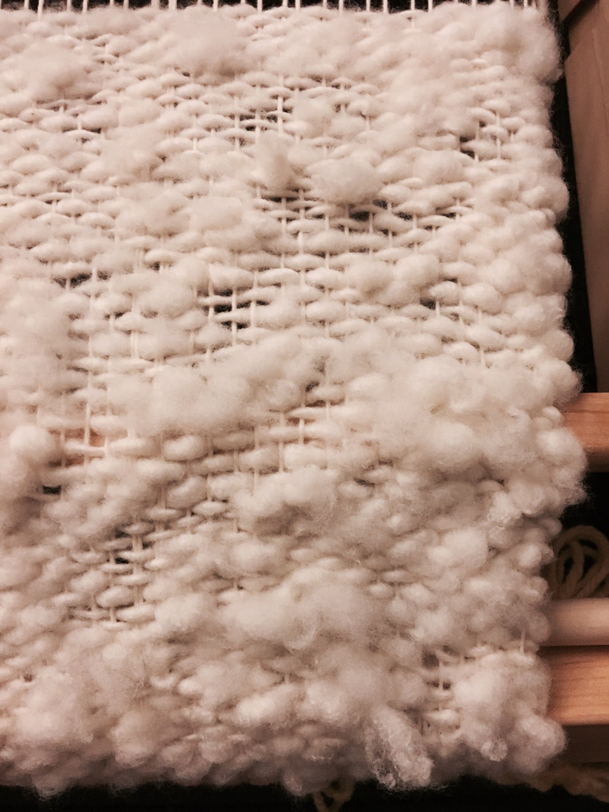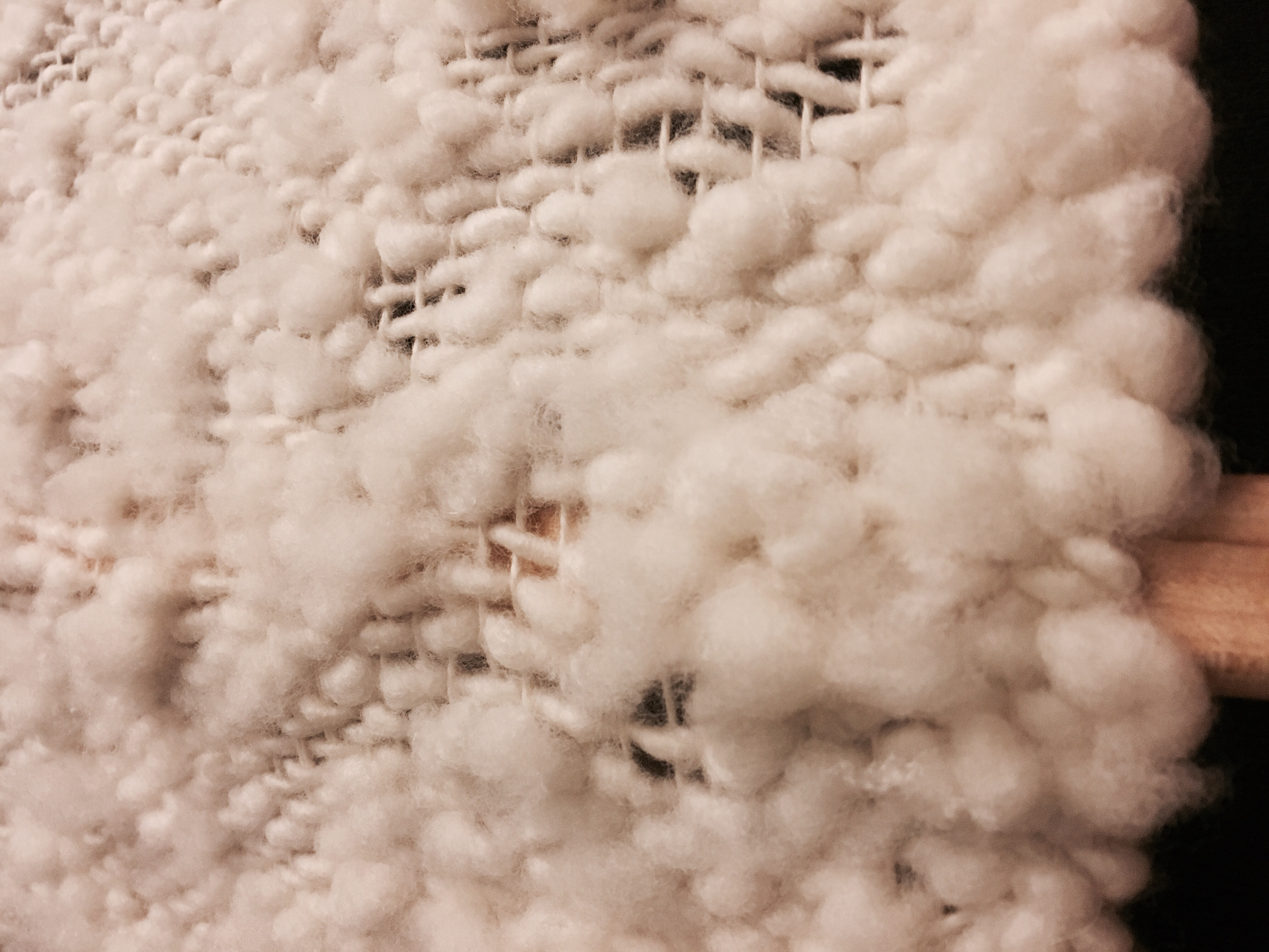 Pulling little puffs of the weft through the warp threads that had my favorite crimpy bits I wanted to show, as I went. Trying to keep things loose, airy, drapey, by not beating too aggressively.