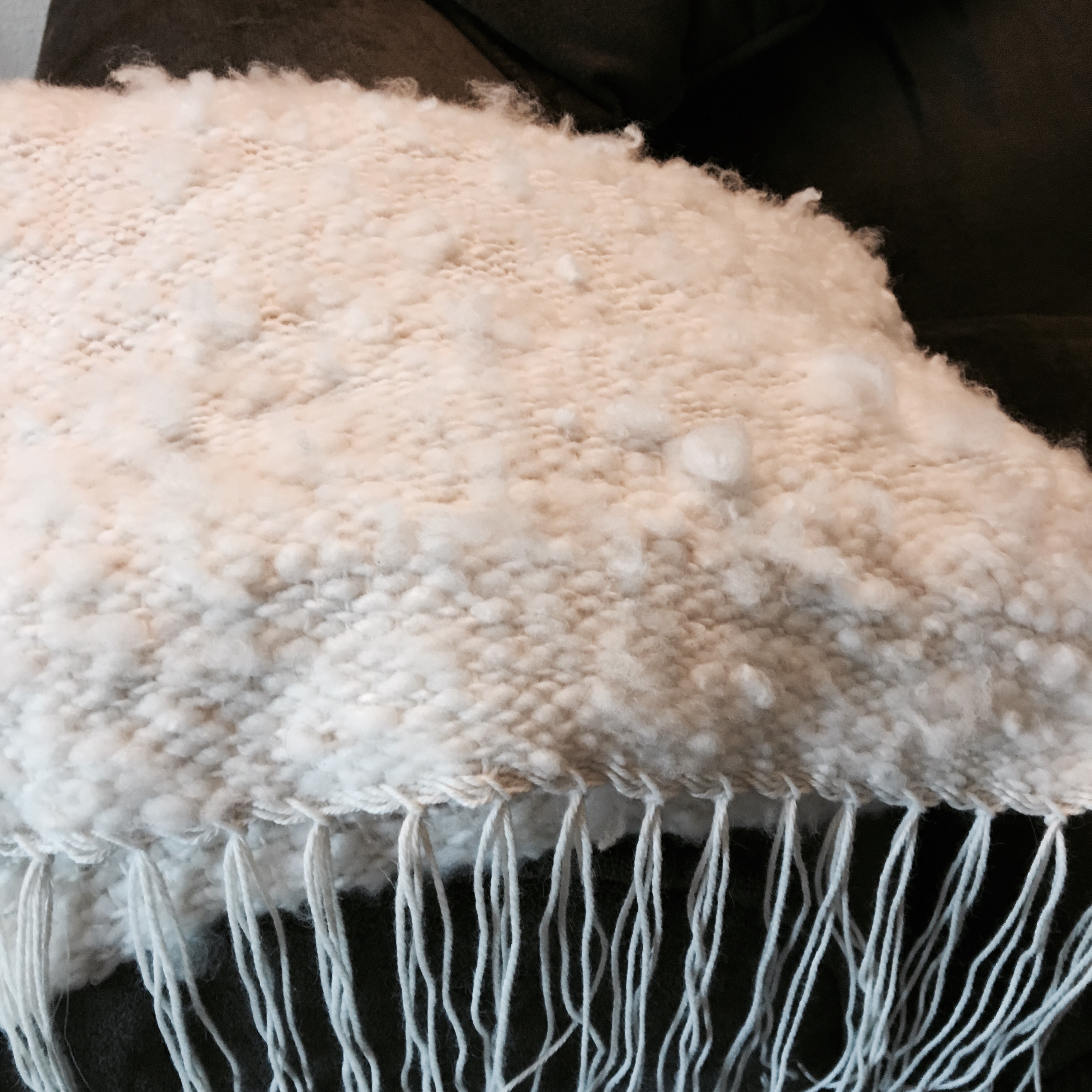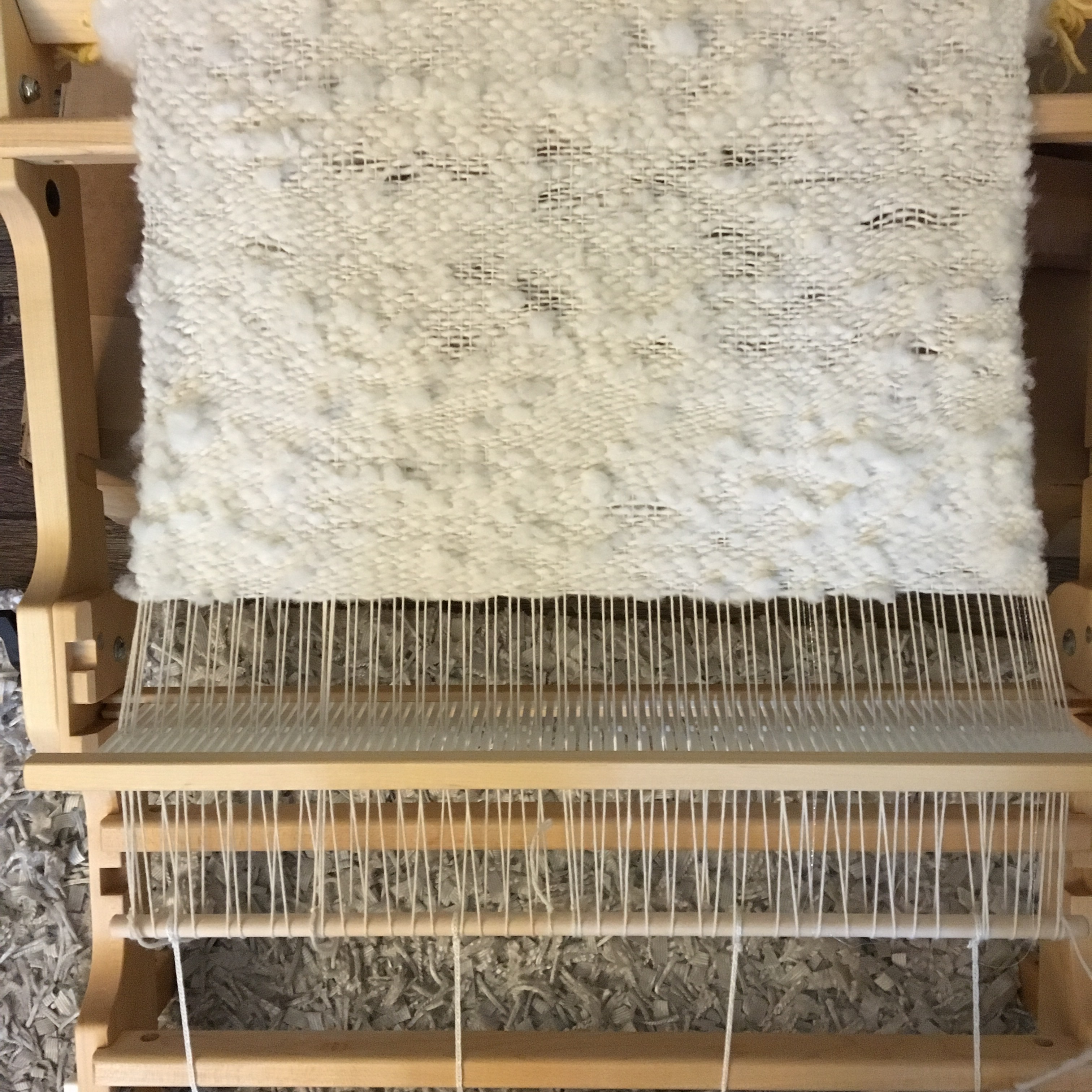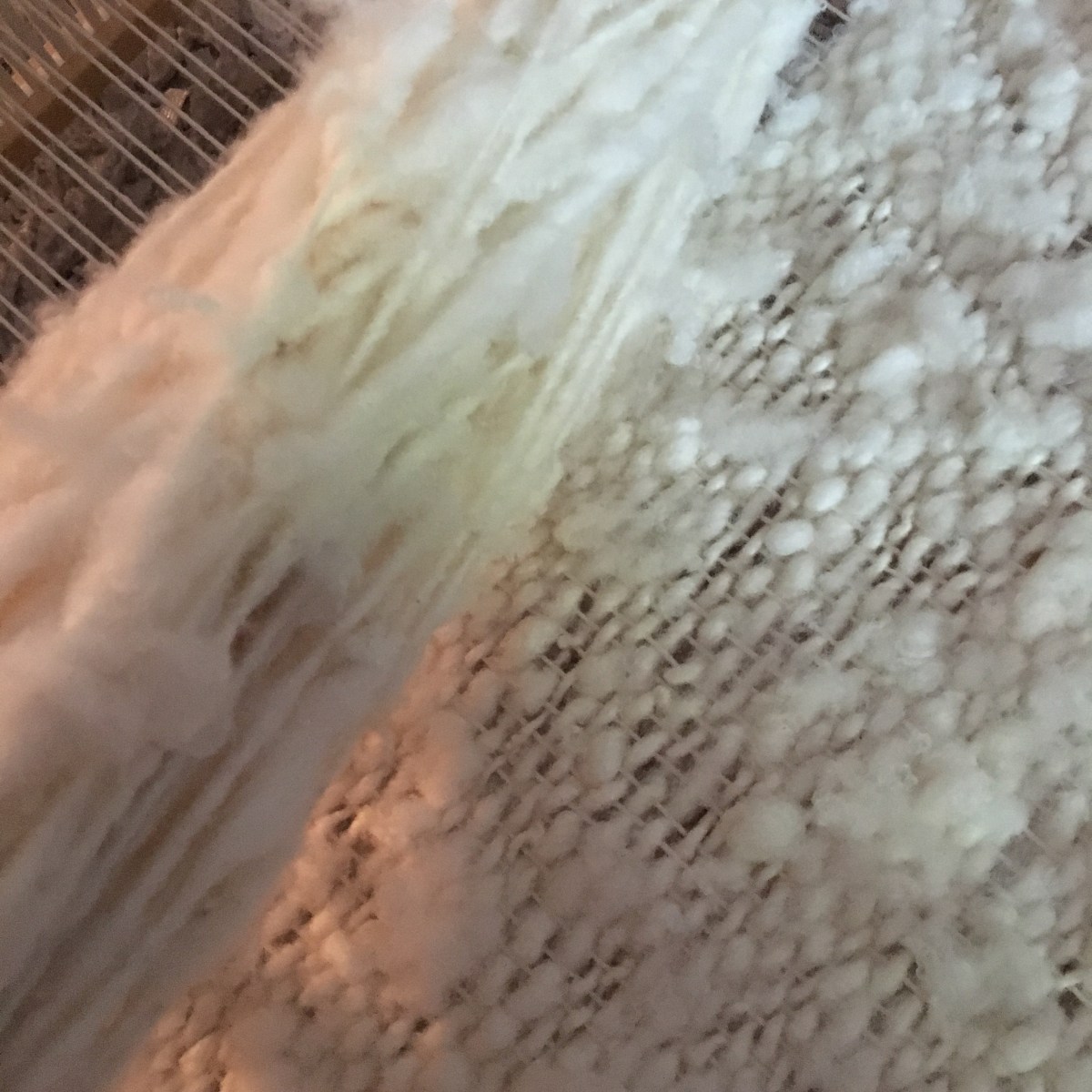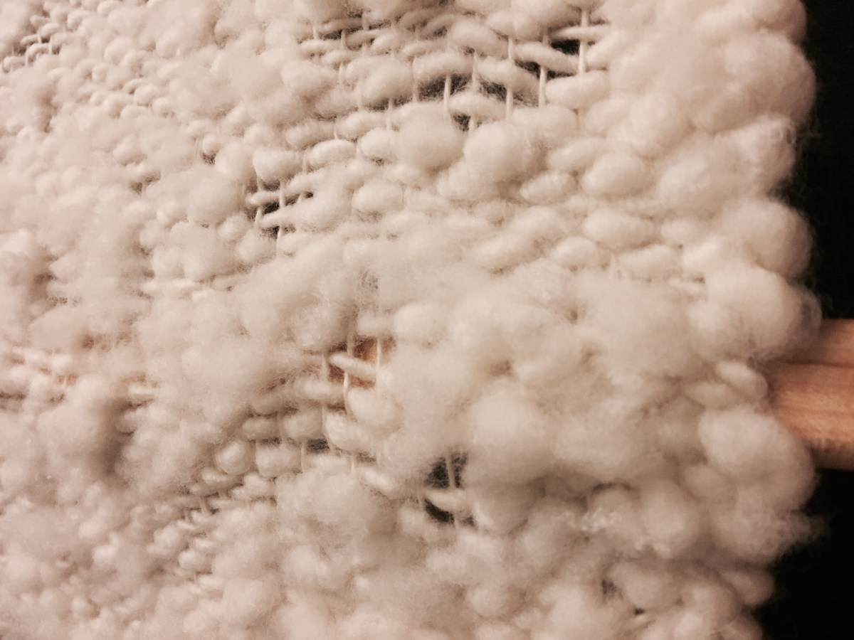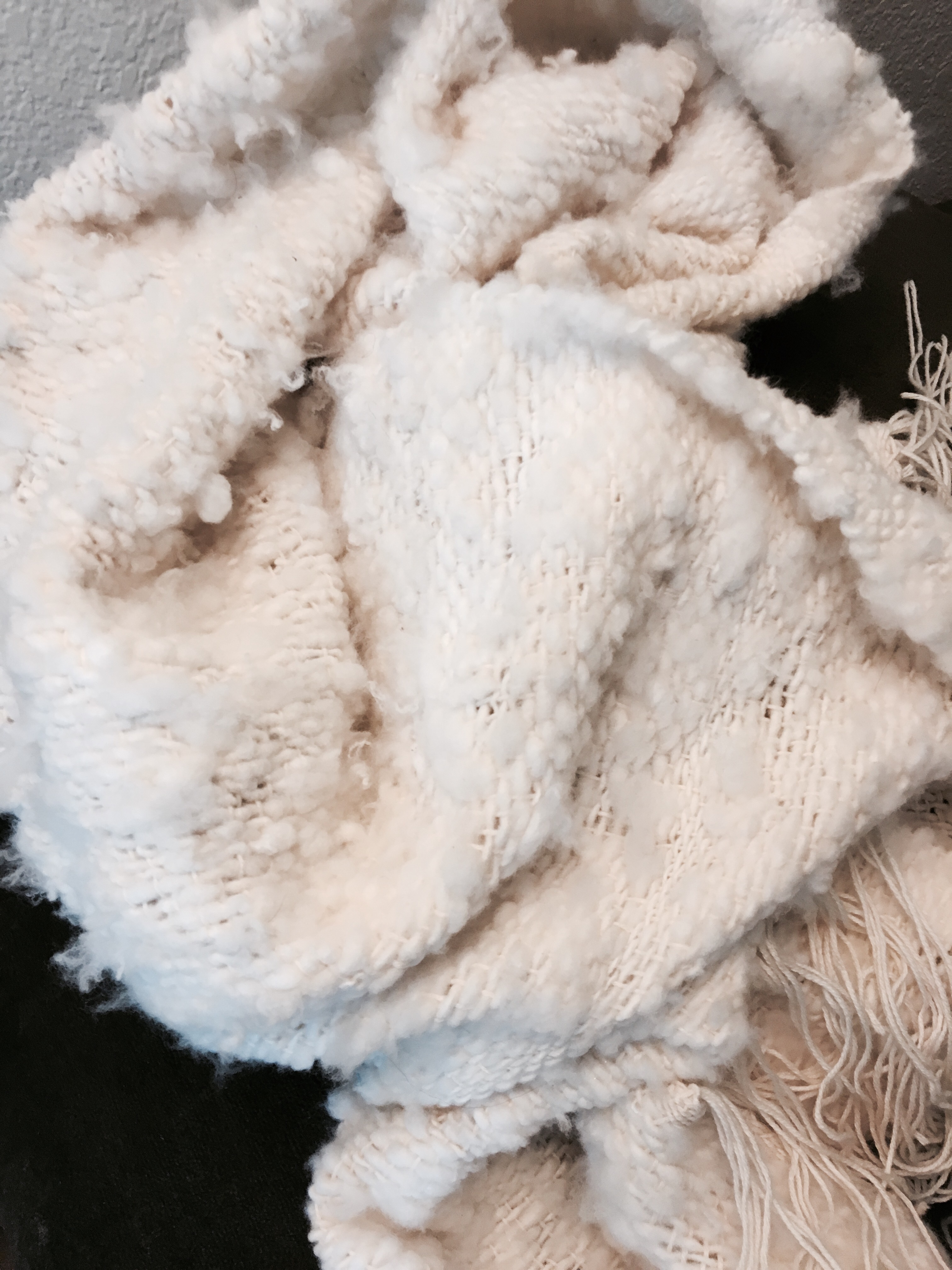 The loom was warped with 2 skeins of a white commercial yarn, made of, 50% alpaca, 25% merino, 25% silk. Since the weft was bulky, I warped every other slot. This being only the second attempt weaving, I wasn’t sure how this would work out, but gauge works the same in weaving, as it does with knitting and crochet. I wanted a fabric that was soft and drapey vs something stiff and able to stand upright by itself.