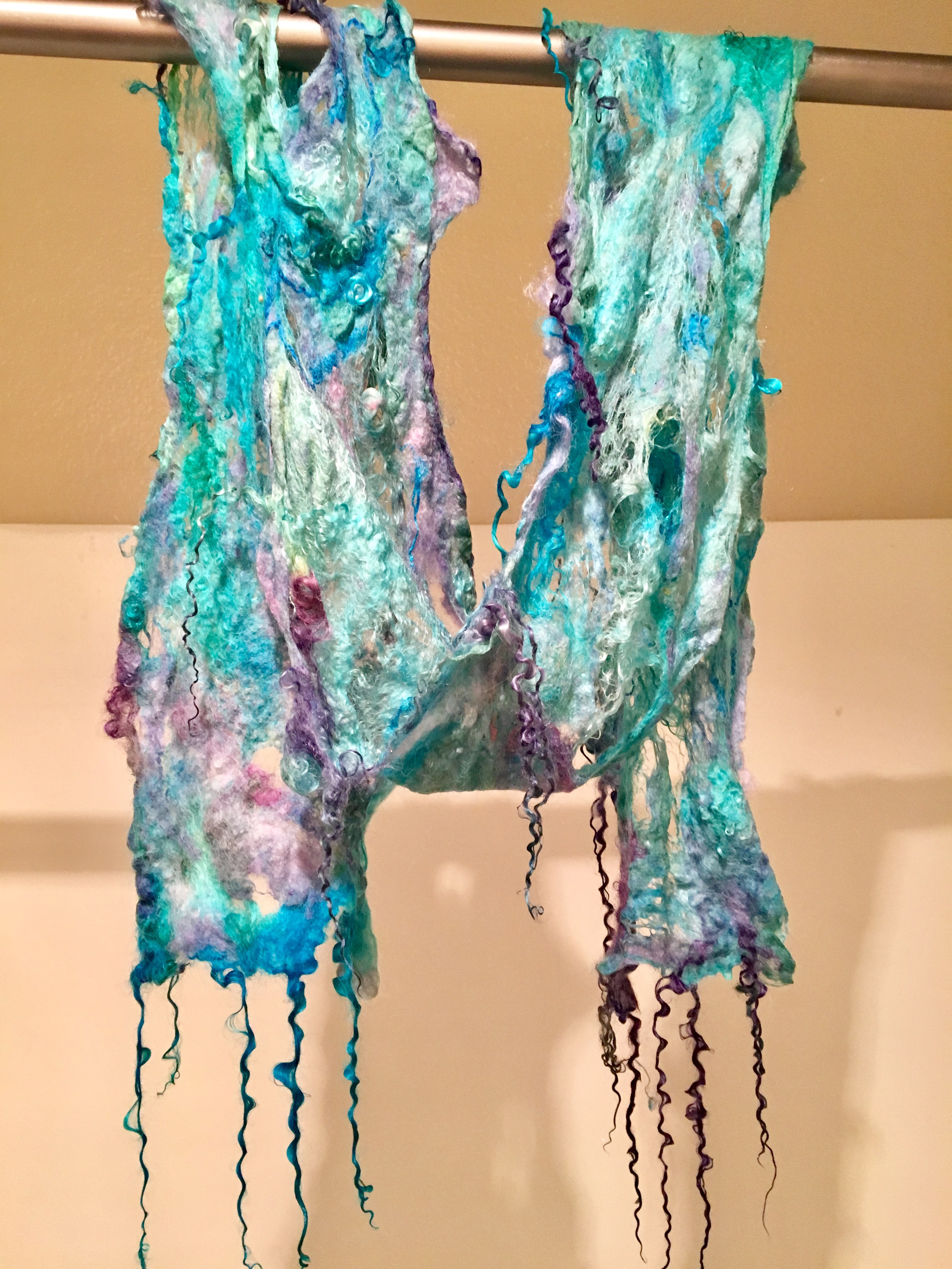 Let me just say wet cobweb felt does not feel felted. Or, maybe it does, but I just don’t have any clue what I’m looking for. I have to say I was really pleased with my result. It was light and airy and soft cobweb felt with teeswater locks dangling and silk integrated into the fabric.
